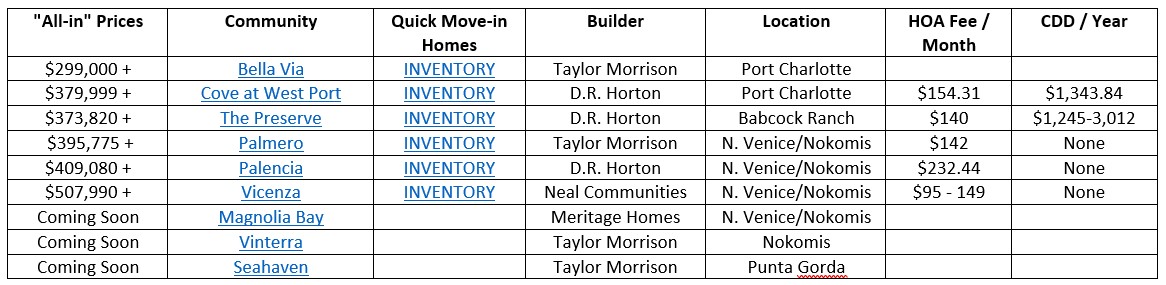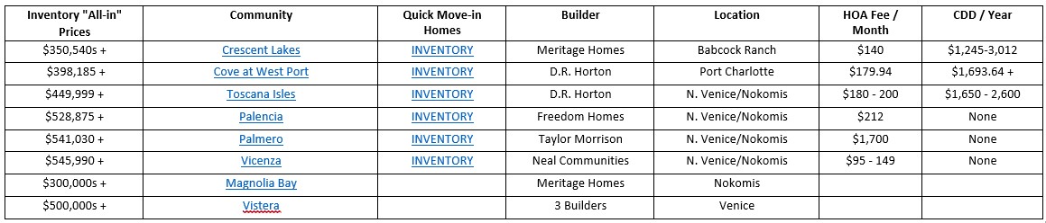 Venice Realty, Inc. offers up to a 2% Rebate to clients upon closing on a New Construction Home in one of the following communities. Contact Us before you contact or visit the Builder/Community to qualify. See Terms of Service.